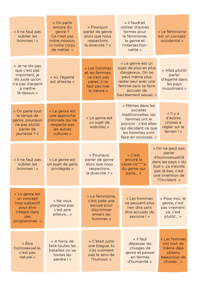 Cette phrase traduit un enjeu à « rendre opérationnel » ce que travailler sur le genre implique, et souligne la nécessité de nourrir d’exemples concrets le travail sur la question. Elle peut aussi traduire un manque de considération à travailler le sujet.