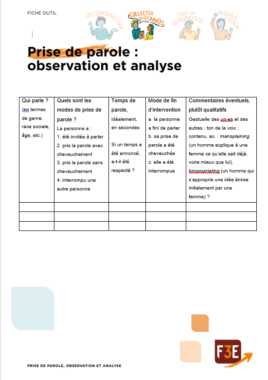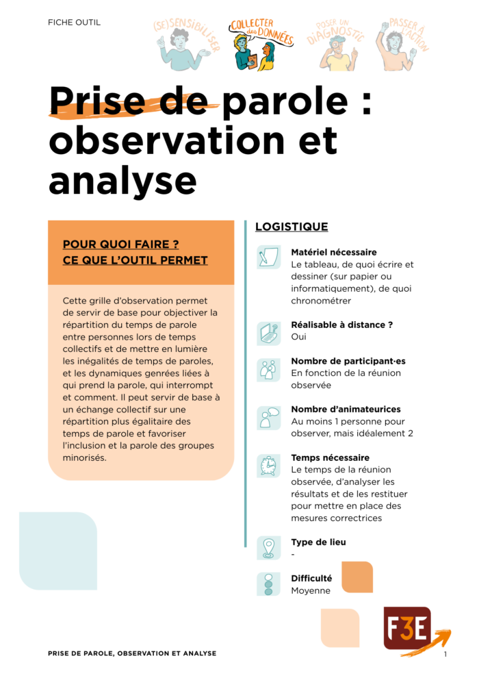Cette grille d’observation permet de servir de base pour objectiver la répartition du temps de parole entre personnes lors de temps collectifs et de mettre en lumière les inégalités de temps de paroles, et les dynamiques genrées liées à qui prend la parole, qui interrompt et comment. Il peut servir de base à un échange collectif sur une répartition plus égalitaire des temps de parole et favoriser l’inclusion et la parole des groupes minorisés.