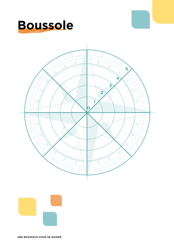 Toujours en sous-groupe, les participant-e-s sont invité-e-s à se projeter dans l’avenir et à identifier la gradation qu’ils et elles souhaiteraient atteindre pour chaque axe de la boussole, à l’horizon que l’animateur-ice aura donné au groupe (1, 3 ou 5 ans par exemple).