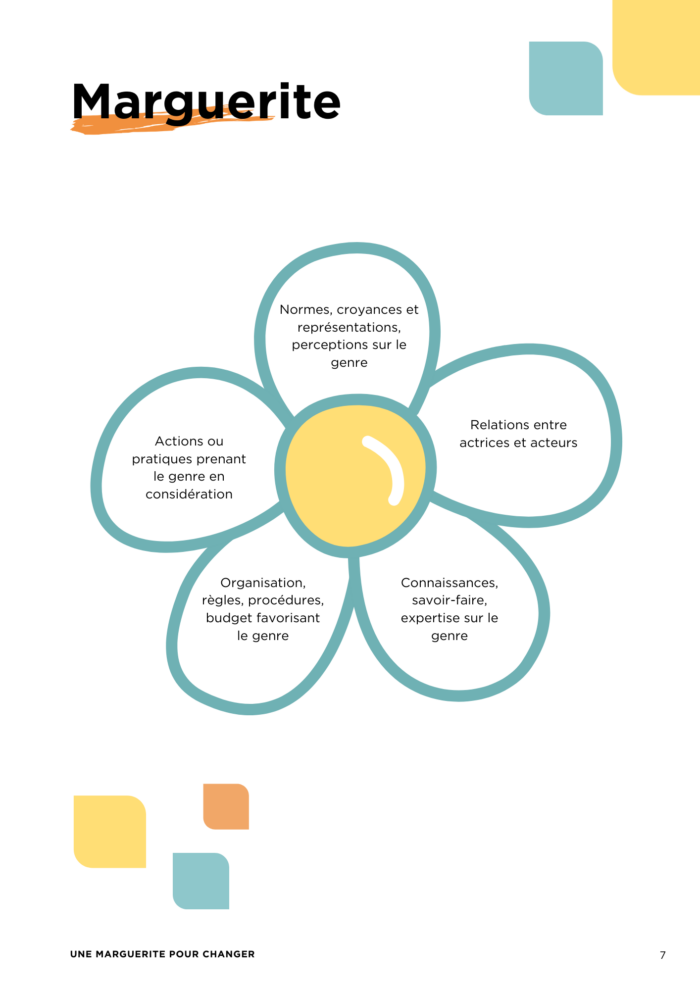 Nous allons procéder à un exercice de réflexion collective autour de la prise en compte de l’approche genre dans notre organisation et nos projets. À l’aide de cette marguerite du changement, nous allons réfléchir autour de 5 dimensions clés pour identifier les changements que nous souhaitons voir advenir pour renforcer notre prise en compte du genre.